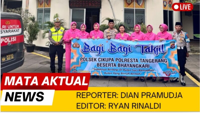 Tangerang | Mata Aktual News — Jajaran Polsek Cikupa bersama Bhayangkari Ranting Cikupa membagikan 50 paket takjil gratis kepada pengguna jalan di depan Mapolsek Cikupa, Jalan Raya Serang Km 15,5, Senin (23/2/2026) sore. Kegiatan sosial ini digelar sebagai bentuk kepedulian kepolisian kepada masyarakat yang masih berada di perjalanan menjelang waktu berbuka puasa.