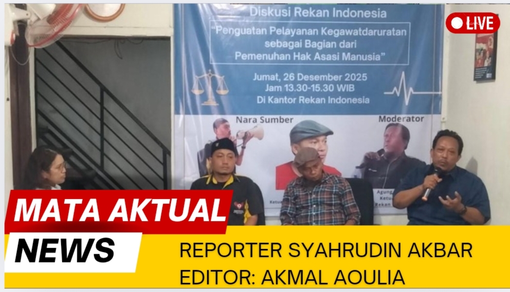 JAKARTA | Mata Aktual News — Rekan Indonesia menggelar Diskusi Akhir Tahun yang mengangkat persoalan pelayanan kegawatdaruratan di Indonesia, Jumat (26/12/2025), di Kantor Rekan Indonesia, Jakarta. Diskusi ini mengungkap masih adanya berbagai kendala serius dalam layanan gawat darurat, mulai dari hambatan administratif hingga ketimpangan akses pelayanan bagi masyarakat.