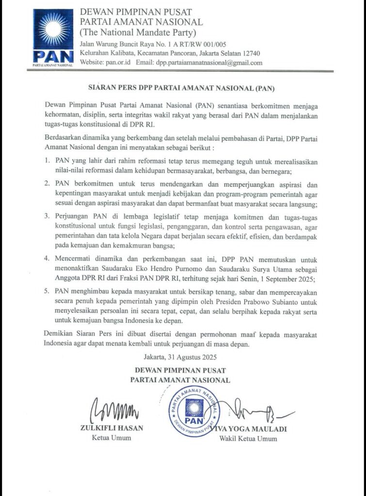 Dalam siaran pers resmi yang ditandatangani Ketua Umum Zulkifli Hasan dan Wakil Ketua Umum Viva Yoga Mulyadi, DPP PAN memutuskan menonaktifkan Eko Hendropurnomo dan Surya Utama sebagai anggota DPR RI, berlaku mulai Senin, 1 September 2025.