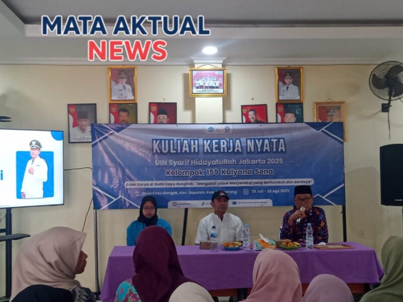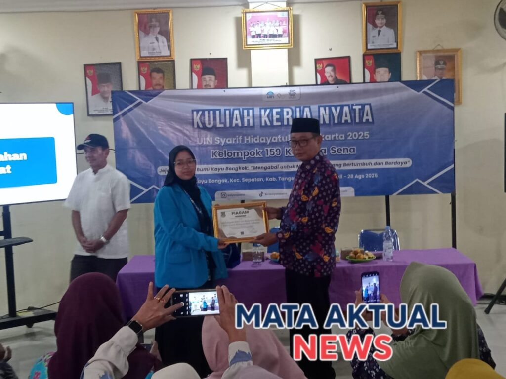 TANGERANG | Mata Aktual News – Kuliah Kerja Nyata (KKN) mahasiswa UIN Syarif Hidayatullah Jakarta resmi ditutup di Desa Kayu Bongkok, Kecamatan Sepatan, Kabupaten Tangerang, Kamis (28/8/2025). Acara penutupan berlangsung khidmat dan penuh keakraban, dihadiri Kepala Desa H. Hamdani, jajaran perangkat desa, tim PKK, karang taruna, RT/RW, dosen pembimbing Drs. Syauki, M.Pd., serta masyarakat setempat.