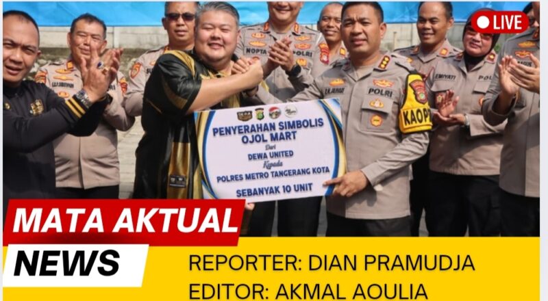 Tangerang, MataAktualNews — Polres Metro Tangerang Kota menerima bantuan 10 unit Ojol Mart dari manajemen Dewa United sebagai bentuk dukungan terhadap pengemudi ojek online (ojol). Serah terima berlangsung pada Jumat (5/12/2025) di area depan Gedung Parkir Polres Metro Tangerang Kota, disaksikan jajaran pejabat utama Polres serta pimpinan Dewa United dan PT Lima Sekawan Indonesia.